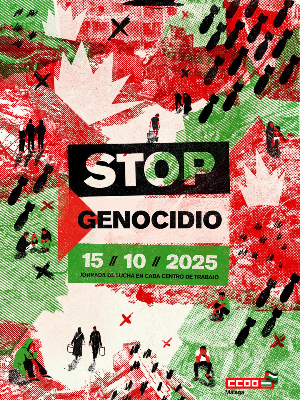 CCOO de Andalucía y UGT Andalucía han convocado una jornada de lucha para denunciar el genocidio del Estado israelí el próximo miércoles, 15 de octubre, en centros de trabajo privados y públicos de la comunidad andaluza. Durante la misma se llevará a cabo una huelga general de dos horas por turno de trabajo, asambleas y concentraciones. Los sindicatos han explicado que esta jornada tiene, entre sus objetivos, exigir el respeto de los derechos humanos del pueblo palestino y el fin del genocidio perpetrado por el Estado de Israel en la franja de Gaza; denunciar la muerte de decenas de miles de personas y dar a conocer al mundo la magnitud de las atrocidades que sufre diariamente el pueblo Palestino; exigir a la comunidad internacional que aplique medidas para prevenir los abusos de fuerza de un Estado sobre otro y garantice la asistencia humanitaria; o exigir la retirada de las sanciones impuestas por las protestas en la vuelta ciclista y otras protestas. En Málaga hay diferentes puntos donde se van a celebrar las concentraciones, siendo el acto central en Alameda principal número 18, jutno a la Delegación Territorial de Gobierno de la Junta de Andalucía