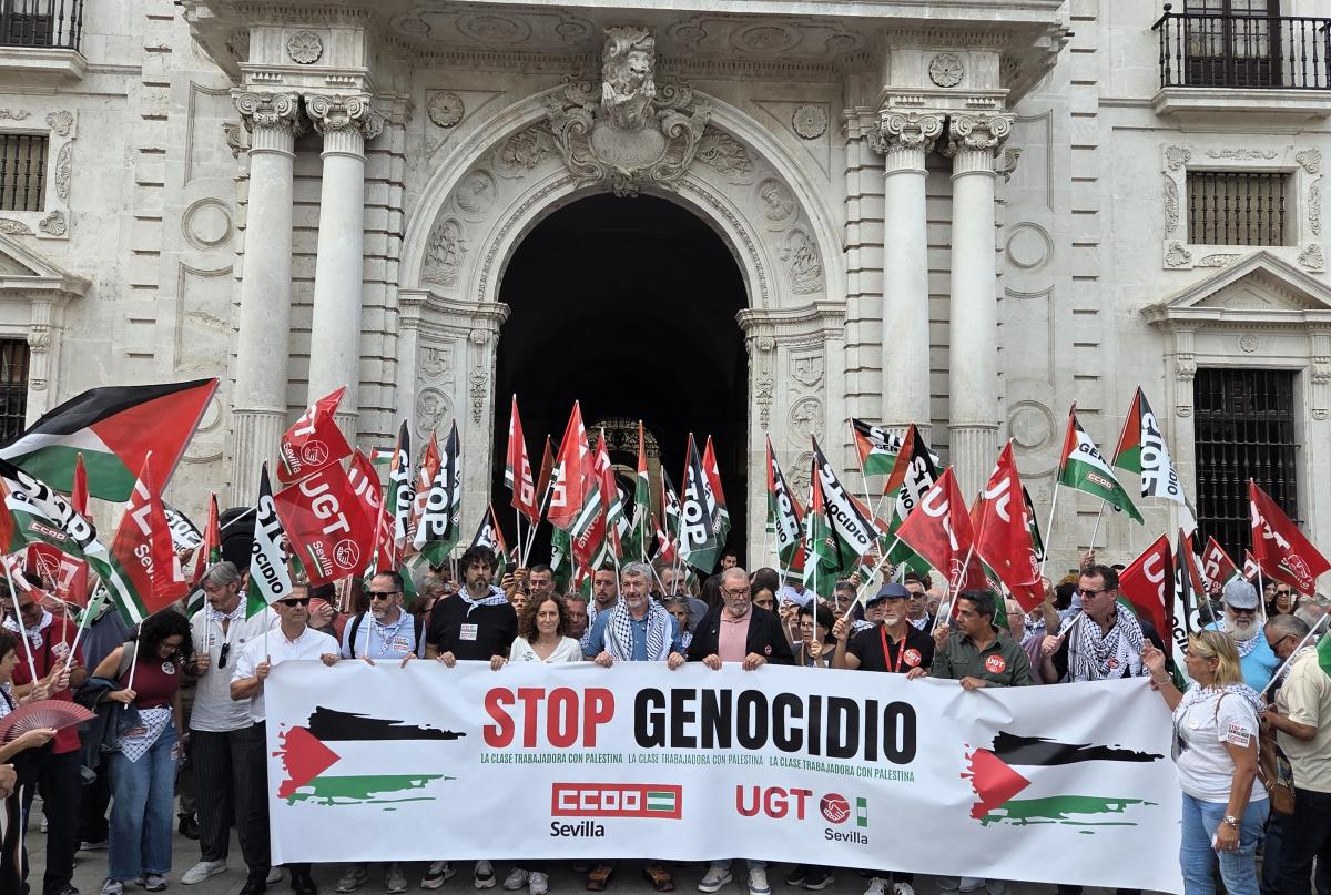 Miles de personas reclaman en Sevilla un futuro para Palestina en el marco de los paros convocados por CCOO y UGT en los centros de trabajo