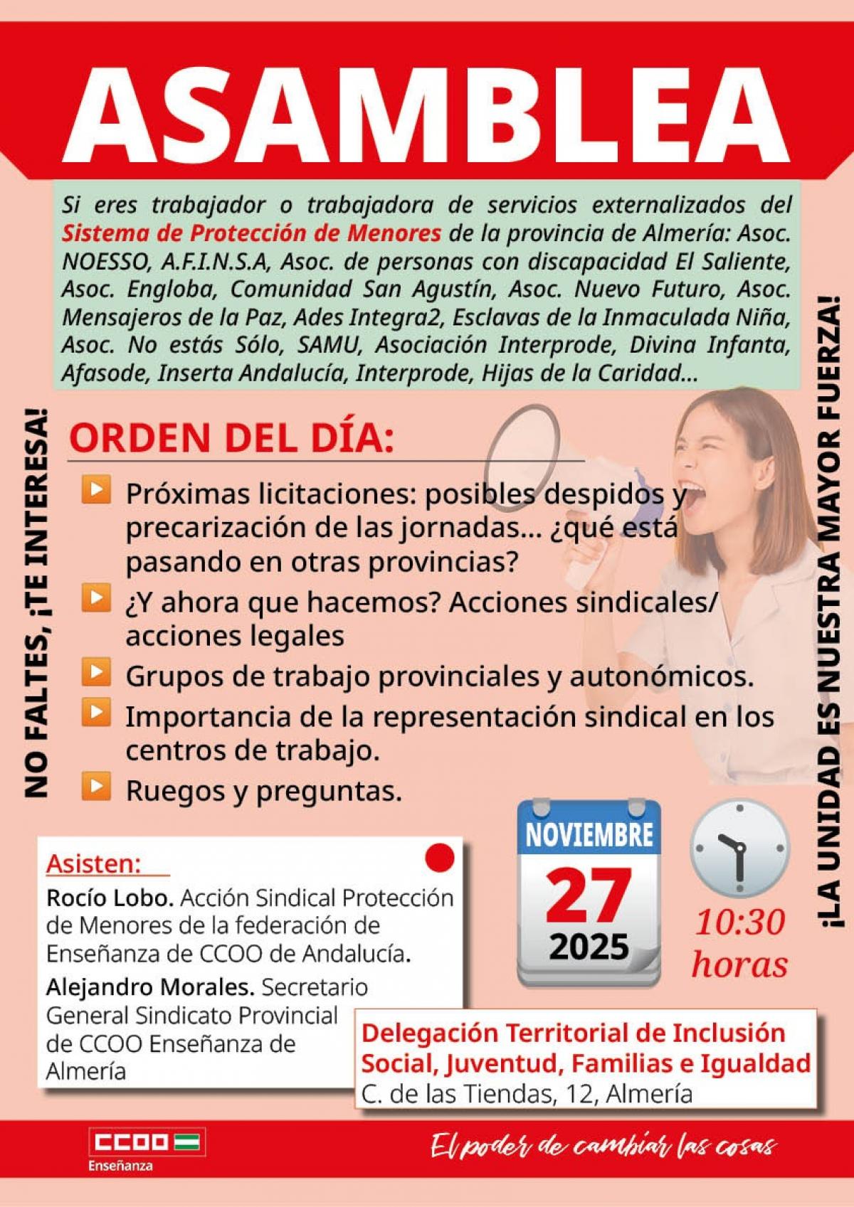 El Sindicato Provincial de Enseñanza de CCOO Almería ha convocado una asamblea abiertadirigida a todo el personal que desempeña su labor en los servicios externalizados del Sistemade Protección de Menores en la provincia. Este encuentro, que tendrá lugar el próximo 27 denoviembre frente a la Delegación Territorial de Inclusión Social, surge como respuesta a lanecesidad imperiosa de informar y organizar a las plantillas ante el escenario de incertidumbreque plantean las próximas licitaciones públicas. La organización sindical busca analizardetalladamente los pliegos de condiciones que regirán la gestión de centros operados porentidades como NOESSO, A.F.I.N.S.A, El Saliente o Engloba, entre otras, para anticiparse acualquier cláusula que pueda suponer un retroceso en derechos.