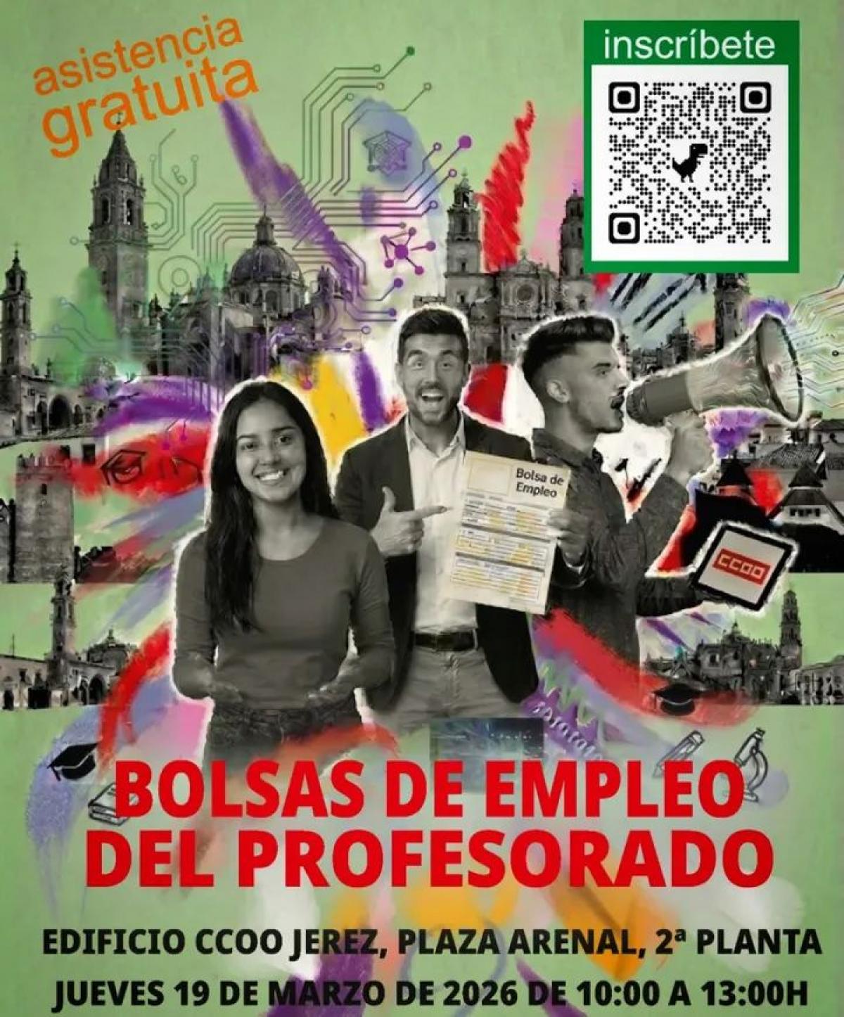 La Unión Local del Sindicato CCOO de Jerez, dentro del programa que está desarrollando este 2026 sobre empleo y capitalidad y con el que pretende incidir en el empleo dentro del marco de la candidatura de la ciudad de Jerez a la capitalidad europea de la cultura en 2031, ofrece de modo gratuito un taller informativo el jueves 19 en horario de 10:00 a 13:00 horas sobre el acceso al empleo docente en Andalucía.